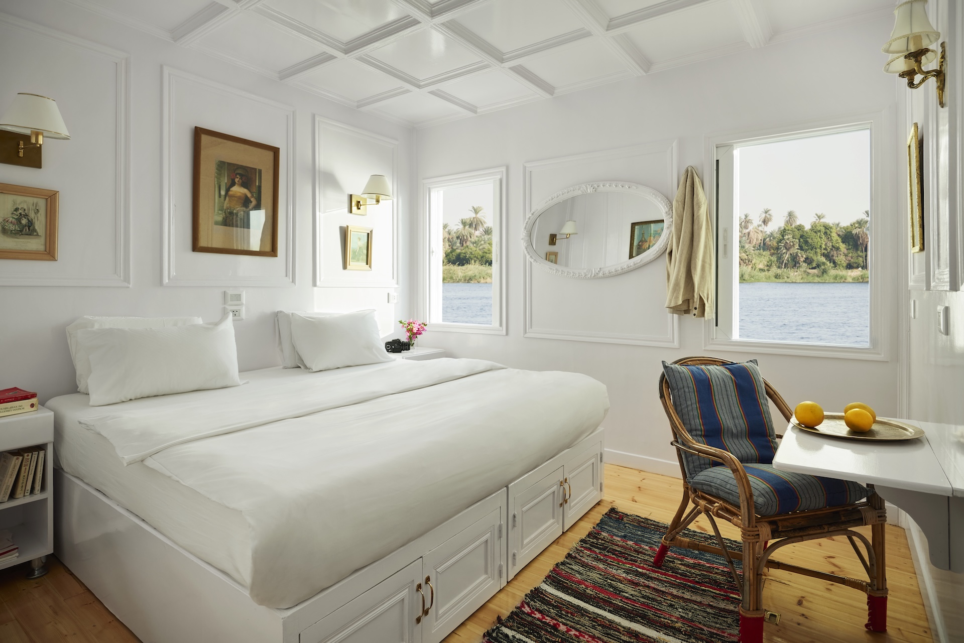 Poppee’s Panoramic Suite is expansive and refined, giving guests the pleasure of wide, uninterrupted Nile views through sweeping windows. The generous space makes it feel less like a cabin and more like a private retreat afloat on the river.